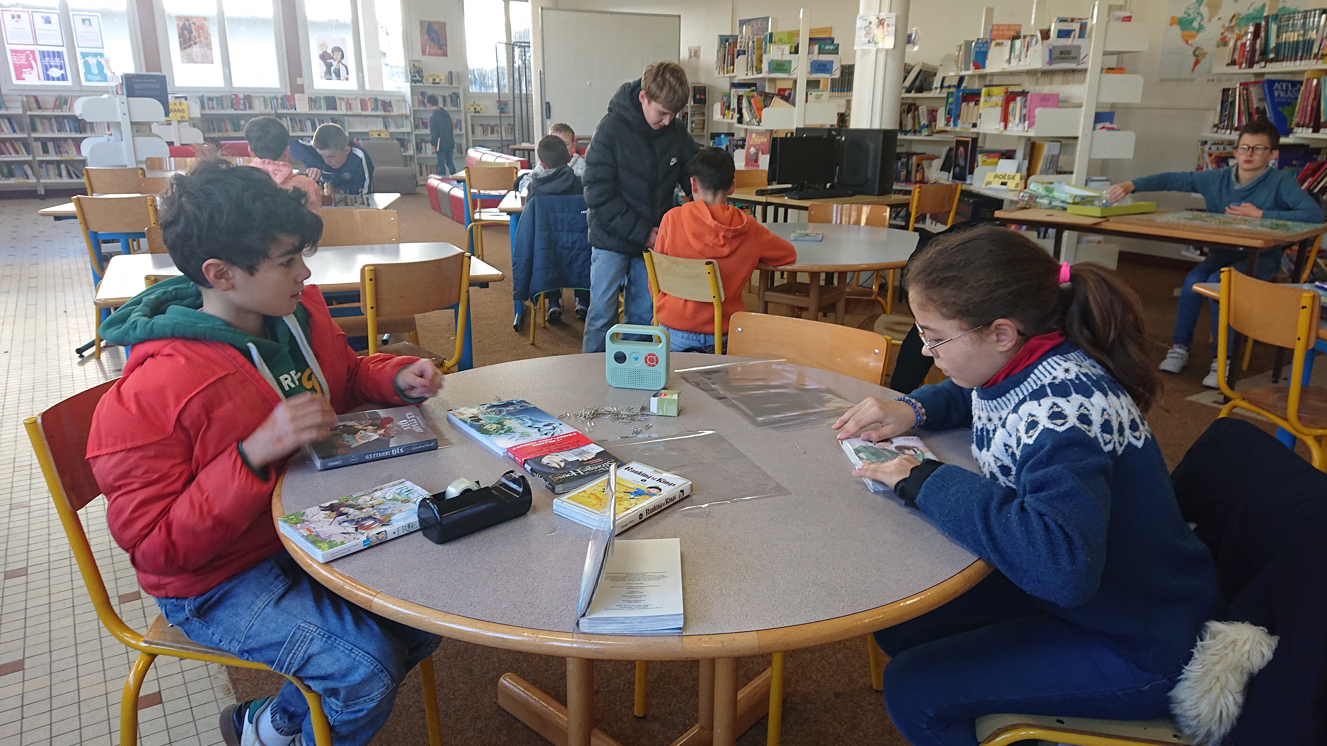 Ils participent aux tâches quotidiennes : couvrir les livres, les ranger, coller des cotes, étiqueter des livres, tamponner les nouvelles revues, trier les magazines, ...